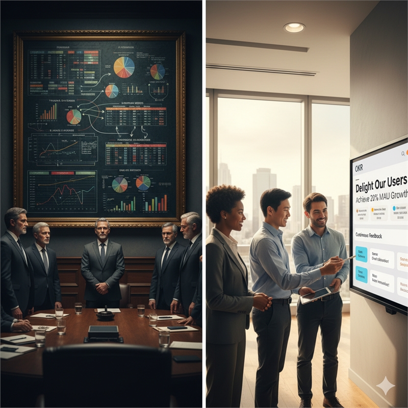 BSC의 KPI가 너무 많아 전략적 집중이 분산되는 문제를 해결하기 위해 OKR(Objectives and Key Results)이 부상했습니다. 핵심은 도전적이고 영감을 주는 목표(O)와 이를 측정하는 소수의 핵심 결과(KR)에 집중합니다.