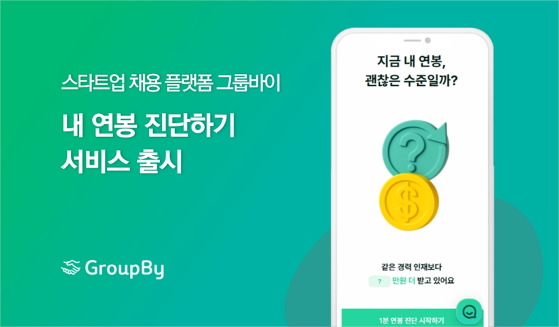 AI로 채용을 혁신하는 스타트업 채용 플랫폼 그룹바이가 경력 · 신입 구직자를 위한 '연봉진단하기' 서비스를 새롭게 출시하였다. ‘내 현재 연봉이 연차 · 평균에 비해 높은 편인가?’ 고민을 해결해 줄 연봉진단 서비스는 개발, 마케팅, 디자인, 기획, 영업, 비즈니스 직군에 해당하는 총 50개 직무에 대해 제공된다. 건강보험공단 데이터를 통해 실제 연봉 정보를 바탕으로 진단이 진행되며 해당 데이터는 연봉진단하기 서비스를 제공하는 목적으로만 사용된다.