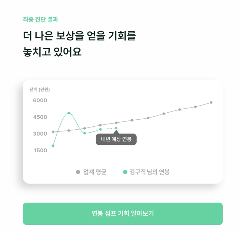 연봉진단하기 서비스를 통해 구직자는 직군별, 연차별 평균 연봉과 자신의 연봉을 비교 가능하며, 자신의 연봉 인상률이 동종업계에서 높은 편인지 낮은 편인지 분석받을 수 있다. 나아가 자신과 동일 직군 · 연차를 가진 구직자들이 그룹바이에서 스카우트 제안을 받는 경우, 구체적으로 어느 수준의 연봉 제안을 받게 되는지도 체크할 수 있다.