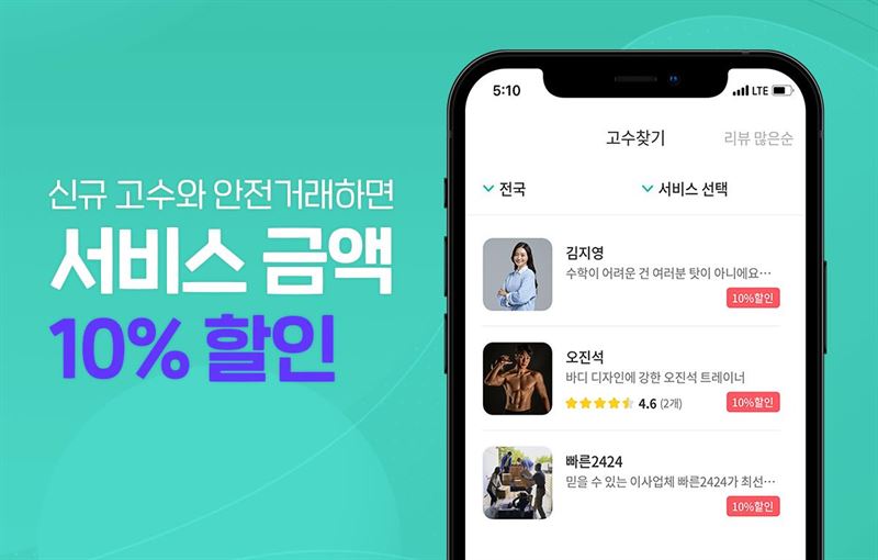 숨고는 실생활에 필요한 서비스를 주변의 고수들과 연결하는 플랫폼으로 300만명 이상의 회원수를 보유하고 있다. 회원수가 많은 만큼 신규 고수들도 늘어나고 있는데 숨고는 이들을 위해서 고객과 안전거래를 하면 서비스 금액의 10%의 할인혜택을 주고있다.